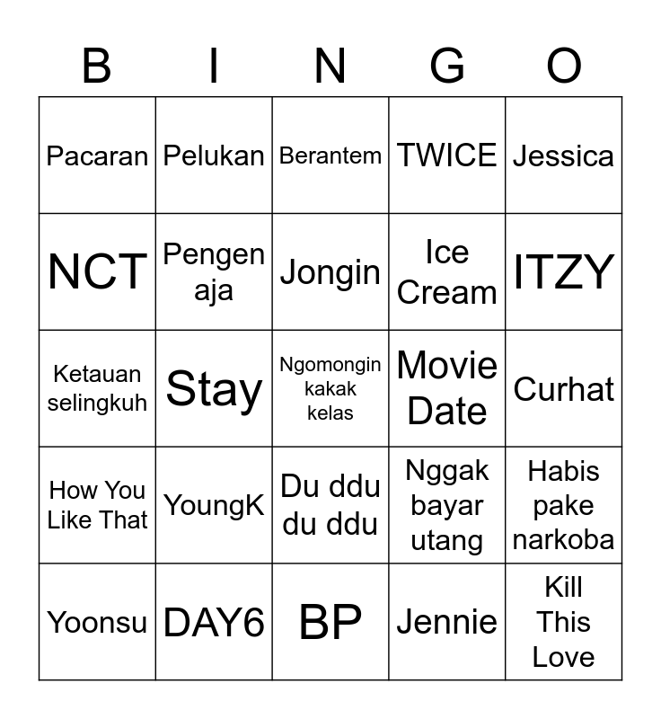 This bingo card has a free space and 24 words: Yoonsu, YoungK, Jongin, Jennie, Jessica, Pacaran, Pelukan, Berantem, Movie Date, Curhat, Ketauan selingkuh, Pengen aja, Nggak bayar utang, Habis pake narkoba, NCT, DAY6, BP, TWICE, ITZY, How You Like That, Stay, Du ddu du ddu, Ice Cream and Kill This Love.