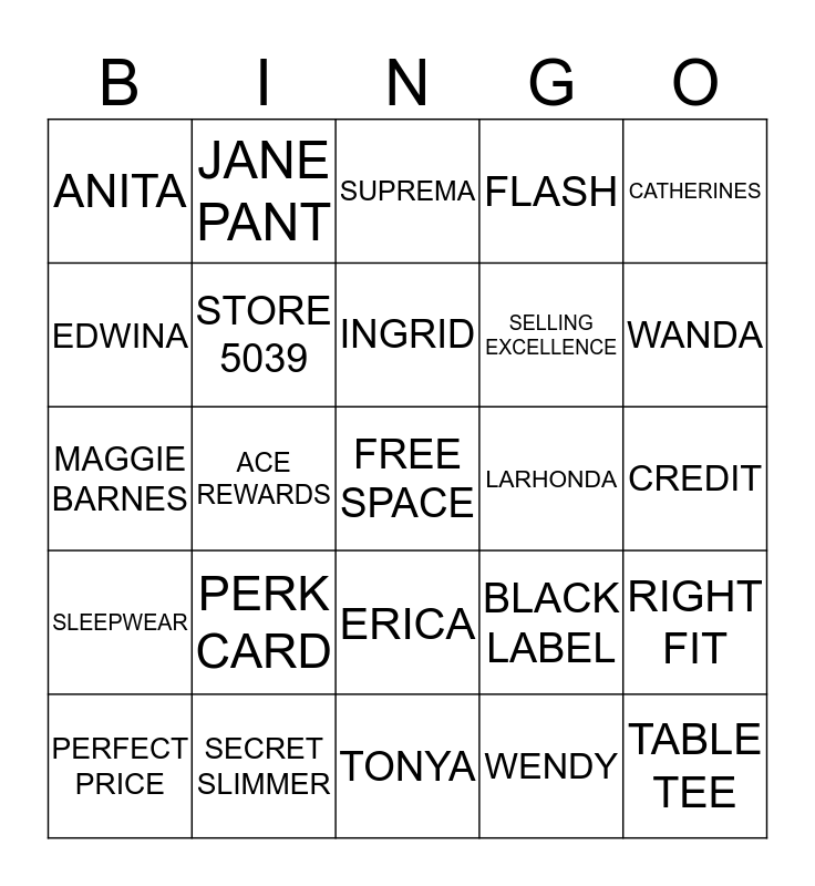 This bingo card has a free space and 24 words: PERK CARD, SECRET SLIMMER, INGRID, PERFECT PRICE, CATHERINES, ANITA, EDWINA, JANE PANT, LARHONDA, ERICA, SELLING EXCELLENCE, MAGGIE BARNES, BLACK LABEL, RIGHT FIT, STORE 5039, WENDY, CREDIT, SUPREMA, WANDA, ACE REWARDS, TABLE TEE, SLEEPWEAR, FLASH and TONYA.