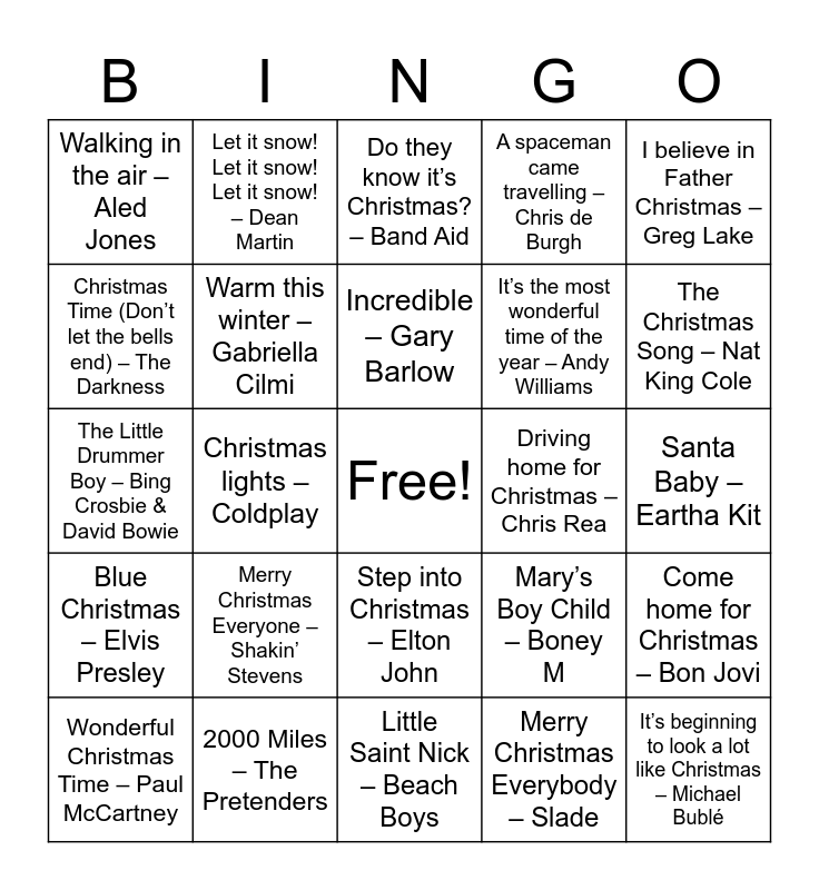 This bingo card has a free space and 44 words: Thanks God it’s Christmas – Queen, It’s beginning to look a lot like Christmas – Michael Bublé, Happy Xmas (War is over) – John Lennon & Yoko Ono, Wonderful Christmas Time – Paul McCartney, I wish it could be Christmas everyday – Wizzard, Merry Christmas Everybody – Slade, Do they know it’s Christmas? – Band Aid, Fairy Tale of New York – The Pogues & Kirsty MacColl, I believe in Father Christmas – Greg Lake, 2000 Miles – The Pretenders, A spaceman came travelling – Chris de Burgh, Driving home for Christmas – Chris Rea, Step into Christmas – Elton John, Merry Christmas Everyone – Shakin’ Stevens, Another rock ‘n’ roll Christmas – Gary Glitter, Little Saint Nick – Beach Boys, Stop the Cavalry – Jona Lewie, The Little Drummer Boy – Bing Crosbie & David Bowie, White Christmas – Bing Crosby, The Christmas Song – Nat King Cole, Let it snow! Let it snow! Let it snow! – Dean Martin, When a child is born – Johnny Mathis, Mistletoe & Wine – Cliff Richard, Walking in the air – Aled Jones, Rockin’ around the Christmas tree – Mel Smith & Kim Wilde, Santa Baby – Eartha Kit, Lonely this Christmas - Mud, Feliz Navidad – José Feliciano, Mary’s Boy Child – Boney M, Blue Christmas – Elvis Presley, All I want for Christmas is you – Mariah Carey, Come home for Christmas – Bon Jovi, Last Christmas – Wham, Underneath the tree – Kelly Clarkson, Christmas lights – Coldplay, River – Ellie Goulding, You can hang your lights on me – Jamie Cullum, Meghan Trainer, Incredible – Gary Barlow, Christmas Time (Don’t let the bells end) – The Darkness, It’s the most wonderful time of the year – Andy Williams, Merry Christmas Darling – The Carpenters, Warm this winter – Gabriella Cilmi and A winter’s tale – David Essex.