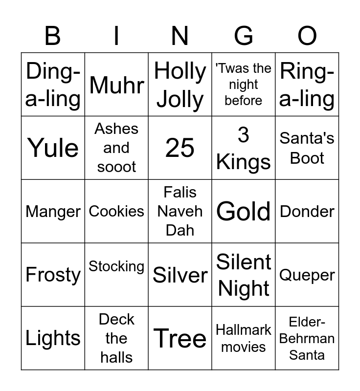 This bingo card has 25 words: Stocking, Tree, 25, Lights, Ring-a-ling, Ding-a-ling, Yule, Muhr, Gold, Silver, 3 Kings, Manger, Silent Night, Queper, Ashes and sooot, Elder-Behrman Santa, Donder, Holly Jolly, Santa's Boot, Cookies, Falis Naveh Dah, Deck the halls, Frosty, 'Twas the night before and Hallmark movies.