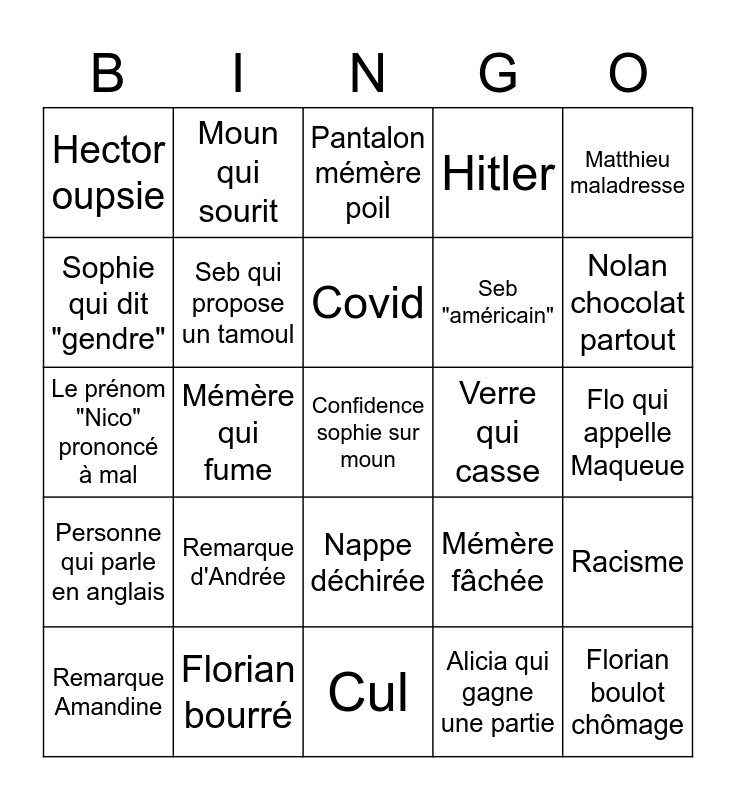 This bingo card has a free space and 24 words: Remarque d'Andrée, Florian bourré, Covid, Remarque Amandine, Matthieu maladresse, Hector oupsie, Sophie qui dit "gendre", Moun qui sourit, Verre qui casse, Nappe déchirée, Seb "américain", Le prénom "Nico" prononcé à mal, Mémère fâchée, Racisme, Seb qui propose un tamoul, Alicia qui gagne une partie, Flo qui appelle Maqueue, Pantalon mémère poil, Nolan chocolat partout, Mémère qui fume, Florian boulot chômage, Personne qui parle en anglais, Hitler and Cul.
