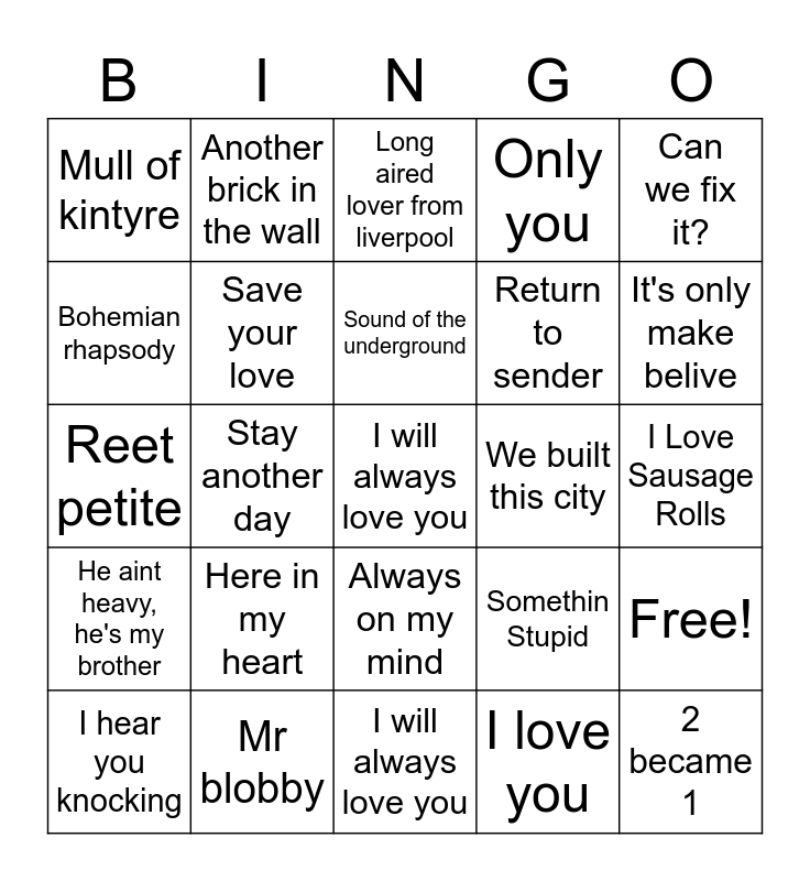 This bingo card has 28 words: Free!, Don't you want me, Return to sender, I love you, Bohemian rhapsody, Long aired lover from liverpool, Another brick in the wall, He aint heavy, he's my brother, We built this city, I hear you knocking, Reet petite, Only you, Mr blobby, I will always love you, It's only make belive, Day tripper, Here in my heart, Save your love, Sound of the underground, Always on my mind, Mull of kintyre, 2 became 1, I will always love you, Stay another day, I Love Sausage Rolls, Somethin Stupid, Can we fix it? and Christmas Alphabet.