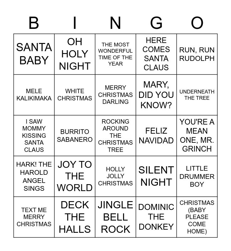 This bingo card has 30 words: DECK THE HALLS, RUDOLPH, THE RED NOSED REINDEER, BURRITO SABANERO, LET IT SNOW, LET IT SNOW, LET IT SNOW, SANTA BABY, THE MOST WONDERFUL TIME OF THE YEAR, WHITE CHRISTMAS, HOLLY JOLLY CHRISTMAS, FELIZ NAVIDAD, JINGLE BELL ROCK, YOU'RE A MEAN ONE, MR. GRINCH, ROCKING AROUND THE CHRISTMAS TREE, DOMINIC THE DONKEY, CHRISTMAS (BABY PLEASE COME HOME), UNDERNEATH THE TREE, FROSTY THE SNOWMAN, SILENT NIGHT, HARK! THE HAROLD ANGEL SINGS, JOY TO THE WORLD, RUN, RUN RUDOLPH, I SAW MOMMY KISSING SANTA CLAUS, WINTER WONDERLAND, OH HOLY NIGHT, MARY, DID YOU KNOW?, MELE KALIKIMAKA, HERE COMES SANTA CLAUS, LITTLE DRUMMER BOY, TEXT ME MERRY CHRISTMAS, MERRY CHRISTMAS DARLING and JINGLE BELLS.