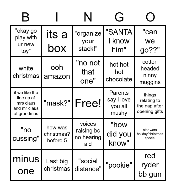 This bingo card has a free space and 24 words: minus one, how was christmas? before 5, "no not that one", "pookie", "can we go??", "okay go play with ur new toy", its a box, "organize your stack!", Parents say i love you all mushy, things relating to the nap after opening gifts, if we like the line up of mrs claus and mr claus at grandmas, ooh amazon, "how did you know", star wars holiday/christmas special, white christmas, Last big christmas, "social distance", "SANTA i know him", cotton headed ninny muggins, "no cussing", "mask?", voices raising bc no hearing aid, hot hot hot chocolate and red ryder bb gun.