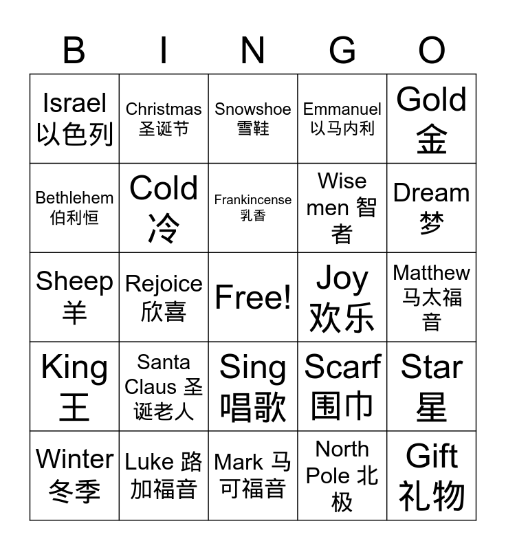 This bingo card has a free space and 47 words: John 约翰福音, Gift 礼物, Silent Night 平安夜, Mark 马可福音, Santa Claus 圣诞老人, December 十二月, Christmas 圣诞节, Jesus 耶稣, Bethlehem 伯利恒, Angels 天使, Cold 冷, Emmanuel 以马内利, Star 星, Scarf 围巾, Myrrh 没药, Snow 雪, Frankincense 乳香, Joy 欢乐, Peace 和平, Gold 金, Rejoice 欣喜, North Pole 北极, Israel 以色列, Wise men 智者, Sweater 毛衣, Dream 梦, Winter 冬季, Worship 崇拜, Sing 唱歌, King 王, Alleluia 阿勒路亚, Snowman 雪人, Baby 婴儿, Ski 滑雪, Birth 出生, Luke 路加福音, Matthew 马太福音, Polar bear 北极熊, Horse 马, Ox 牛, Manger 马槽, Snowshoe 雪鞋, Sheep 羊, Candle 蜡烛, Turkey 火鸡, Shepherds 牧羊人 and Jingle bells 铃儿响叮当.
