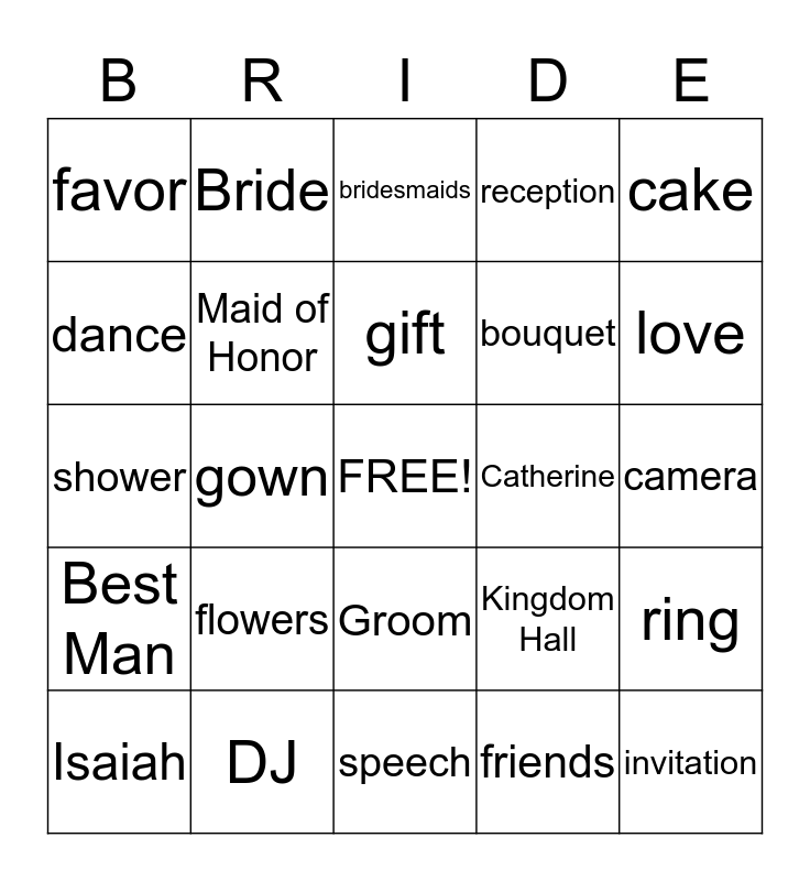 This bingo card has a free space and 24 words: flowers, DJ, gift, Isaiah, cake, favor, dance, Bride, Catherine, Groom, bouquet, shower, Kingdom Hall, ring, Maid of Honor, friends, camera, bridesmaids, love, gown, invitation, Best Man, reception and speech.