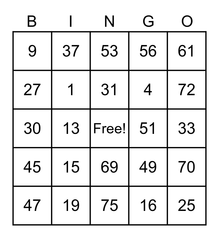 This bingo card has a free space and 24 words: 15, 19, 31, 47, 61, 9, 27, 37, 51, 69, 4, 30, 49, 70, 1, 16, 33, 53, 72, 13, 25, 45, 56 and 75.