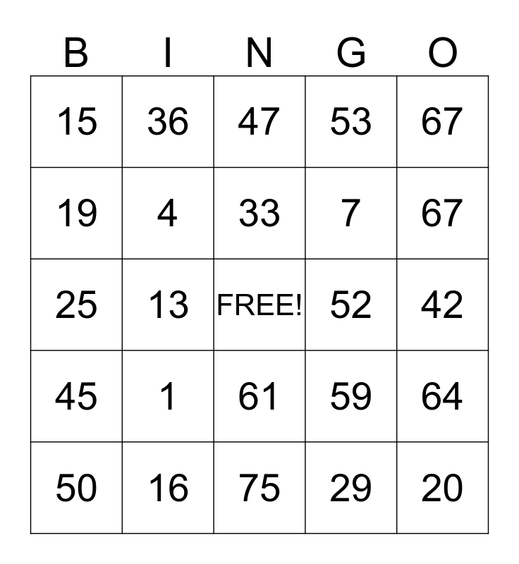 This bingo card has a free space and 24 words: 1, 16, 33, 50, 67, 15, 19, 36, 52, 61, 7, 25, 59, 64, 4, 29, 42, 47, 67, 13, 20, 45, 53 and 75.