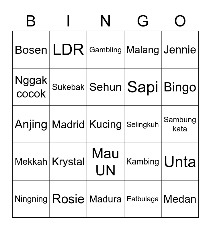 This bingo card has a free space and 24 words: Krystal, Rosie, Sehun, Ningning, Jennie, Bosen, Nggak cocok, LDR, Selingkuh, Mau UN, Sapi, Anjing, Kambing, Unta, Sukebak, Eatbulaga, Sambung kata, Gambling, Bingo, Madrid, Medan, Mekkah, Malang and Madura.