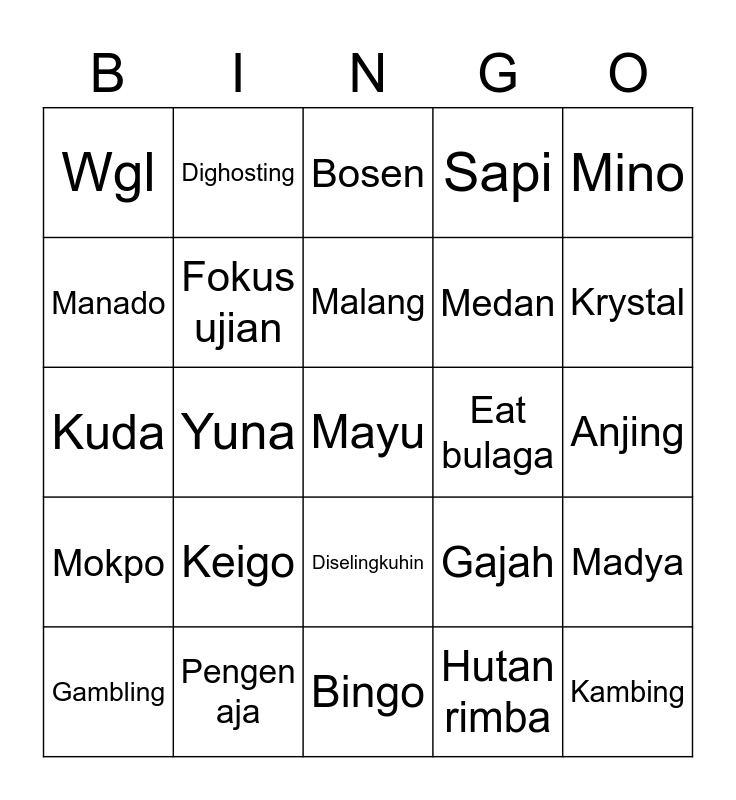 This bingo card has a free space and 24 words: Keigo, Pengen aja, Malang, Gambling, Mino, Wgl, Manado, Dighosting, Eat bulaga, Diselingkuhin, Medan, Kuda, Gajah, Madya, Fokus ujian, Hutan rimba, Anjing, Bosen, Krystal, Yuna, Kambing, Mokpo, Sapi and Bingo.