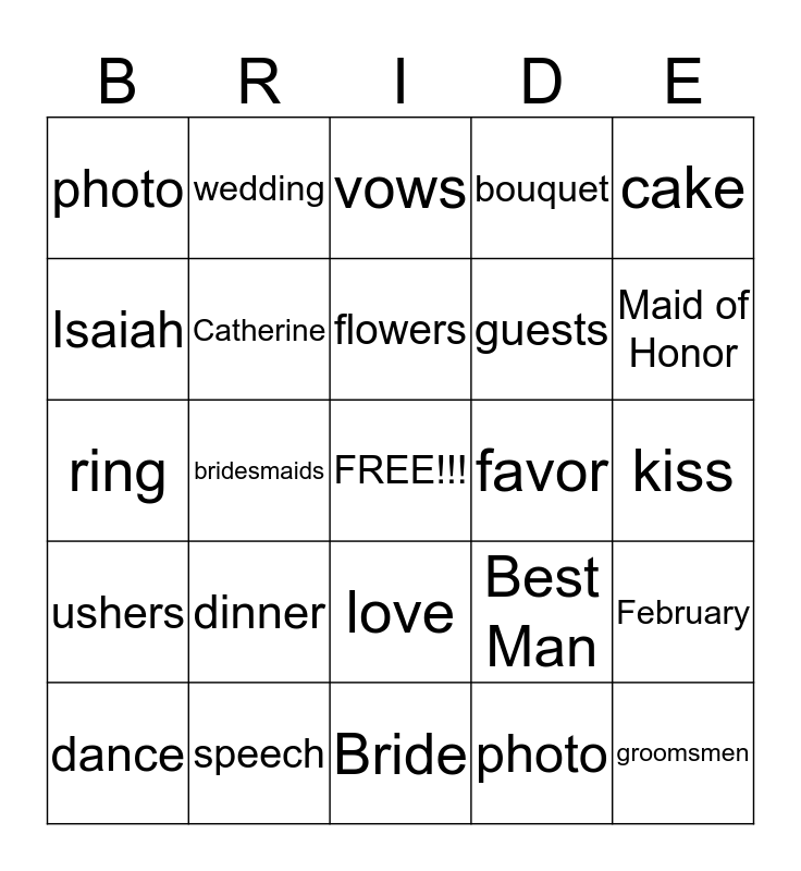 This bingo card has a free space and 24 words: dinner, speech, flowers, dance, cake, photo, Isaiah, wedding, favor, love, guests, ring, Best Man, February, Catherine, photo, kiss, vows, Maid of Honor, bridesmaids, groomsmen, ushers, bouquet and Bride.
