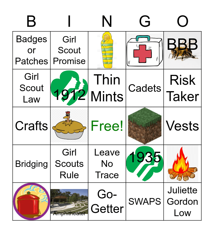 This bingo card has 10 images, a free space and 18 words: Girl Scouts Rule, Amphitheater, Thin Mints, BBB, Badges or Patches, Girl Scout Law, Girl Scout Promise, Leave No Trace, Cadets, Crafts, 1935, 1912, SWAPS, Vests, Risk Taker, Juliette Gordon Low, Bridging and Go-Getter.