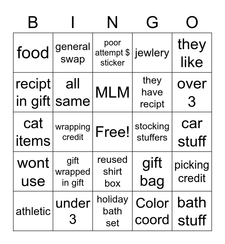 This bingo card has a free space and 34 words: Color swap, Color coord, handmade, unusable gc, wont use, all same, they like, athletic, general swap, obvious cheap, MLM, poor attempt $ sticker, masks, hyperspecific but still generic, stocking stuffers, over 3, under 3, cat items, gift wrapped in gift, gift bag, reused shirt box, monogrammed, food, car stuff, holiday bath set, bath stuff, jewlery, vera bradley, they have recipt, recipt in gift, school things, wrapping credit, picking credit and bought it credit.