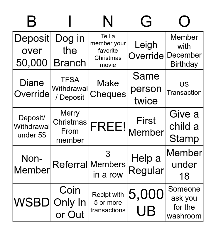 This bingo card has a free space and 24 words: Referral, Coin Only In or Out, Make Cheques, WSBD, Member with December Birthday, Deposit over 50,000, Diane Override, Dog in the Branch, First Member, 3 Members in a row, Same person twice, Deposit/ Withdrawal under 5$, Help a Regular, Member under 18, TFSA Withdrawal / Deposit, 5,000 UB, Give a child a Stamp, Tell a member your favorite Christmas movie, US Transaction, Merry Christmas From member, Someone ask you for the washroom, Non-Member, Leigh Override and Recipt with 5 or more transactions.
