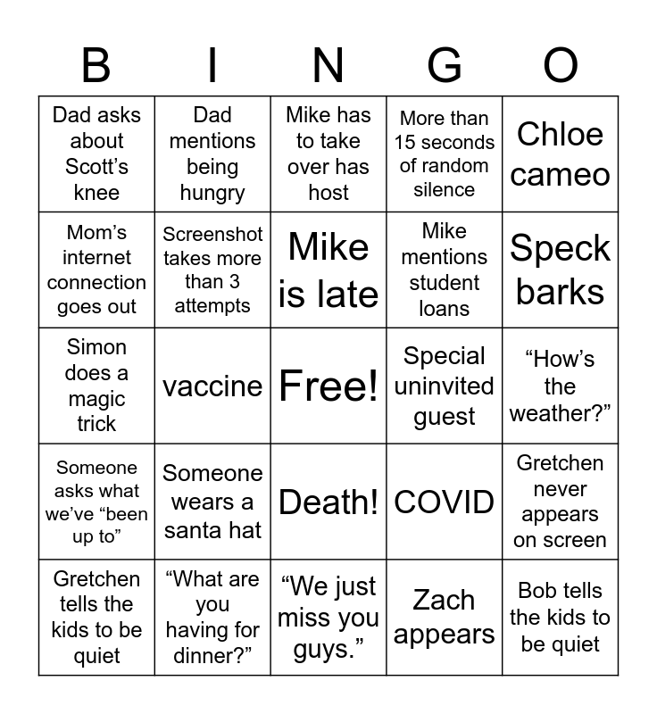 This bingo card has a free space and 24 words: Someone wears a santa hat, “What are you having for dinner?”, Mike is late, Gretchen tells the kids to be quiet, Chloe cameo, Dad asks about Scott’s knee, Mom’s internet connection goes out, Dad mentions being hungry, Special uninvited guest, Death!, Mike mentions student loans, Simon does a magic trick, COVID, Gretchen never appears on screen, Screenshot takes more than 3 attempts, Zach appears, “How’s the weather?”, Mike has to take over has host, Speck barks, vaccine, Bob tells the kids to be quiet, Someone asks what we’ve “been up to”, More than 15 seconds of random silence and “We just miss you guys.”.