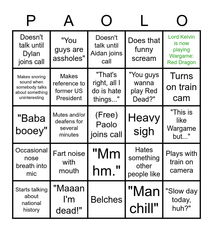 This bingo card has a free space and 24 words: Fart noise with mouth, "Maaan I'm dead!", "That's right, all I do is hate things...", Starts talking about national history, Lord Kelvin is now playing Wargame: Red Dragon, Doesn't talk until Dylan joins call, Makes snoring sound when somebody talks about something uninteresting, "You guys are assholes", Heavy sigh, "Mm hm.", "You guys wanna play Red Dead?", "Baba booey", Hates something other people like, Plays with train on camera, Makes reference to former US President, "Man chill", "This is like Wargame but...", Doesn't talk until Aidan joins call, Turns on train cam, Mutes and/or deafens for several minutes, "Slow day today, huh?", Occasional nose breath into mic, Does that funny scream and Belches.