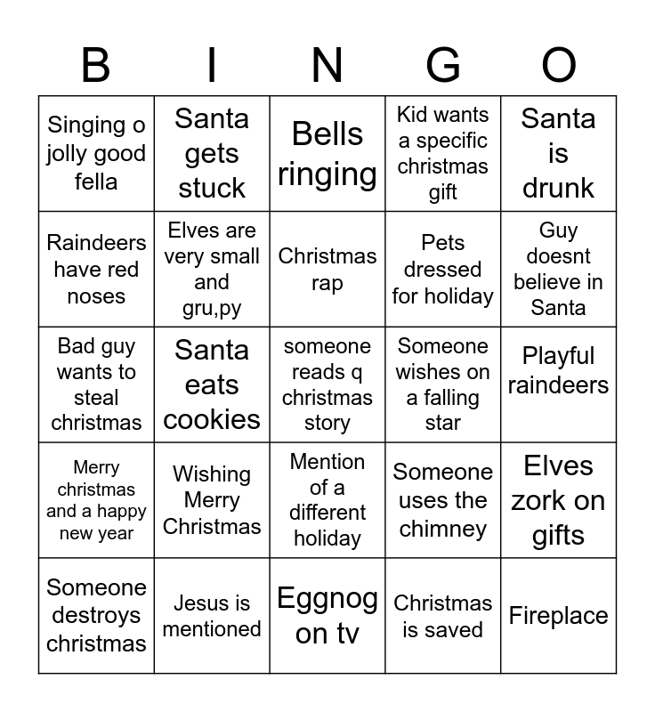 This bingo card has a free space and 24 words: Wishing Merry Christmas, Jesus is mentioned, Christmas rap, Someone destroys christmas, Santa is drunk, Singing o jolly good fella, Raindeers have red noses, Santa gets stuck, Someone wishes on a falling star, Mention of a different holiday, Pets dressed for holiday, Bad guy wants to steal christmas, Someone uses the chimney, Elves zork on gifts, Elves are very small and gru,py, Christmas is saved, Playful raindeers, Bells ringing, Guy doesnt believe in Santa, Santa eats cookies, Fireplace, Merry christmas and a happy new year, Kid wants a specific christmas gift and Eggnog on tv.