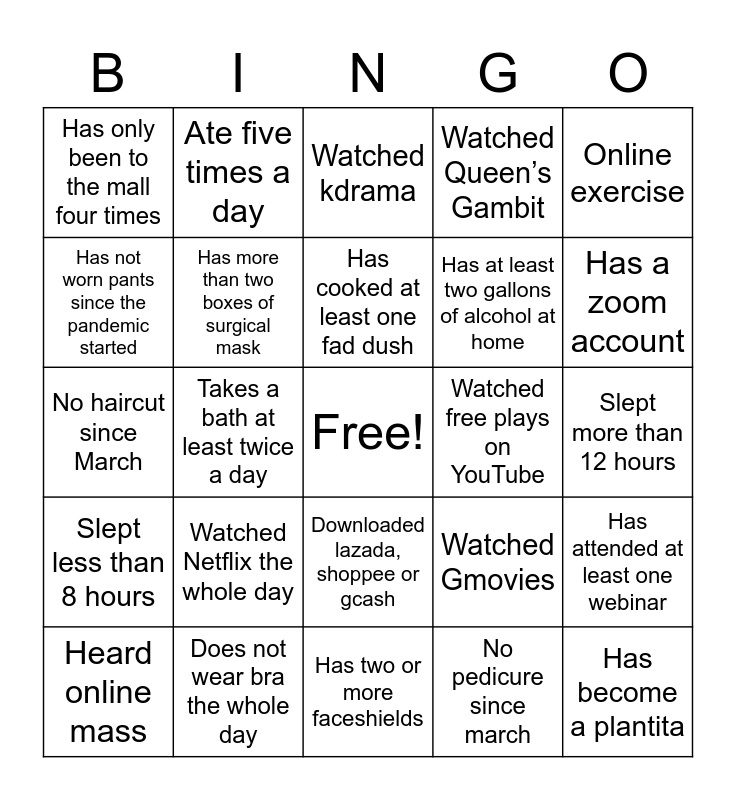 This bingo card has a free space and 24 words: Watched Netflix the whole day, Does not wear bra the whole day, Has cooked at least one fad dush, Heard online mass, Online exercise, Has only been to the mall four times, Has not worn pants since the pandemic started, Ate five times a day, Watched free plays on YouTube, Downloaded lazada, shoppee or gcash, Has at least two gallons of alcohol at home, No haircut since March, Watched Gmovies, Has attended at least one webinar, Has more than two boxes of surgical mask, No pedicure since march, Slept more than 12 hours, Watched kdrama, Has a zoom account, Takes a bath at least twice a day, Has become a plantita, Slept less than 8 hours, Watched Queen’s Gambit and Has two or more faceshields.