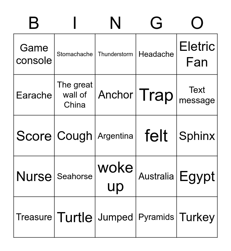 This bingo card has a free space and 24 words: Seahorse, Turtle, Anchor, Treasure, Eletric Fan, Game console, Earache, Stomachache, felt, woke up, Trap, Score, Australia, Egypt, The great wall of China, Pyramids, Sphinx, Thunderstorm, Text message, Cough, Turkey, Nurse, Headache and Jumped.