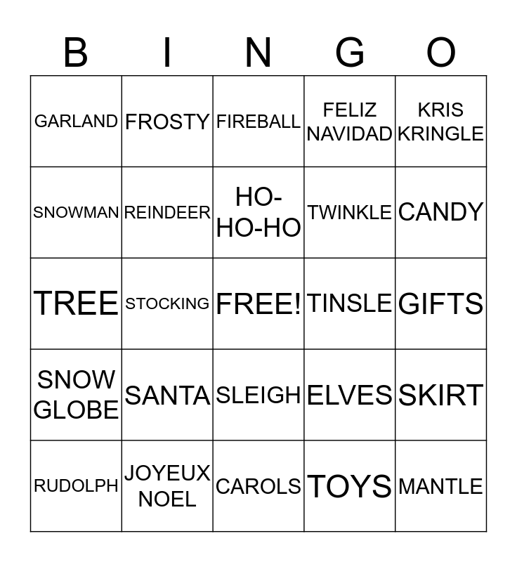 This bingo card has a free space and 24 words: SANTA, JOYEUX NOEL, HO-HO-HO, RUDOLPH, KRIS KRINGLE, GARLAND, SNOWMAN, FROSTY, TINSLE, SLEIGH, TWINKLE, TREE, ELVES, SKIRT, REINDEER, TOYS, GIFTS, FIREBALL, CANDY, STOCKING, MANTLE, SNOW GLOBE, FELIZ NAVIDAD and CAROLS.