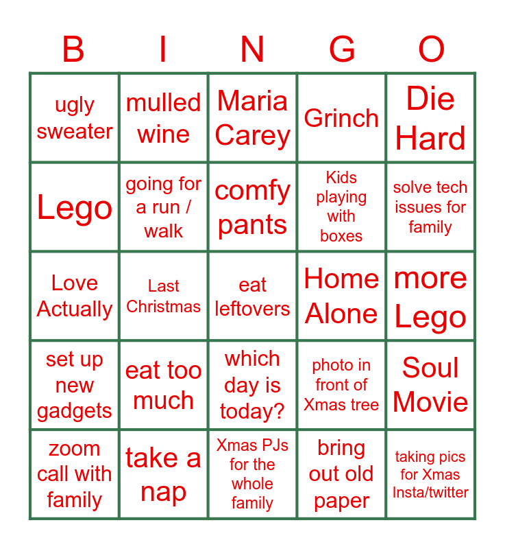 This bingo card has a free space and 24 words: eat too much, take a nap, comfy pants, zoom call with family, Die Hard, ugly sweater, Lego, mulled wine, Home Alone, which day is today?, Kids playing with boxes, Love Actually, photo in front of Xmas tree, Soul Movie, going for a run / walk, bring out old paper, more Lego, Maria Carey, solve tech issues for family, Last Christmas, taking pics for Xmas Insta/twitter, set up new gadgets, Grinch and Xmas PJs for the whole family.