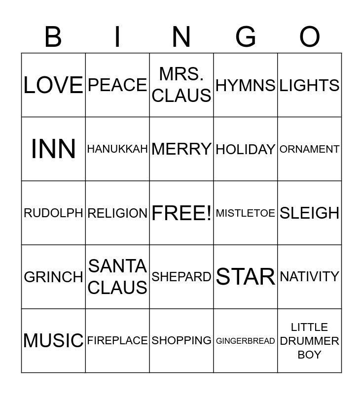 This bingo card has a free space and 60 words: FAMILY, FIREPLACE, FROSTY THE SNOWMAN, GRINCH, GINGERBREAD, GRACE, HANUKKAH, HEAVENLY, HOLIDAY, HOPE, HYMNS, ICICLES, INN, JACK FROST, KRISS KRINGLE, LOVE, LITTLE DRUMMER BOY, LIGHTS, MANGER, MERRY, MISTLETOE, MRS. CLAUS, MUSIC, NATIVITY, NEW YEAR'S DAY, NOEL, NORTH POLE, NUTS, ORNAMENT, PARADE, PRANCER, PRESENTS, PRAYER, POINSETTA, PEACE, REINDEER, REJOICE, RELIGION, RIBBONS, RUDOLPH, SAINT NICK, SANTA CLAUS, SLEIGH, SILVER BELLS, STAR, SAVIOR, SCROOGE, SLEIGH BELLS, SNOWMAN, SHEPARD, SHOPPING, SONGS, WINTER, WISE MEN, WORSHIPPER, WRAPPING PAPER, XMAS, YOUTH, ZESTY and COWBOYS.