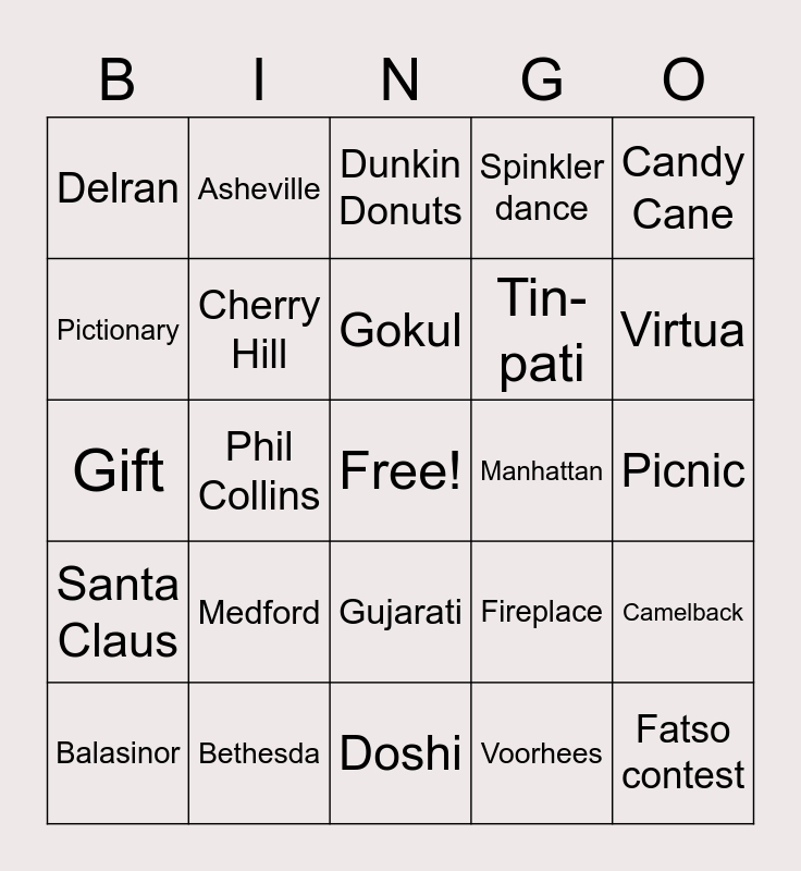 This bingo card has a free space and 29 words: Balasinor, Savitri Ba, Phil Collins, John Cusack, Delran, Dunkin Donuts, Cherry Hill, Medford, Manhattan, Bethesda, Picnic, Fatso contest, Doshi, Voorhees, Virtua, Margaritas, Gujarati, Santa Claus, Candy Cane, Gift, Fireplace, Chutney Sandwich, Tin-pati, Pictionary, Spinkler dance, Asheville, Camelback, Gokul and Mumbai.