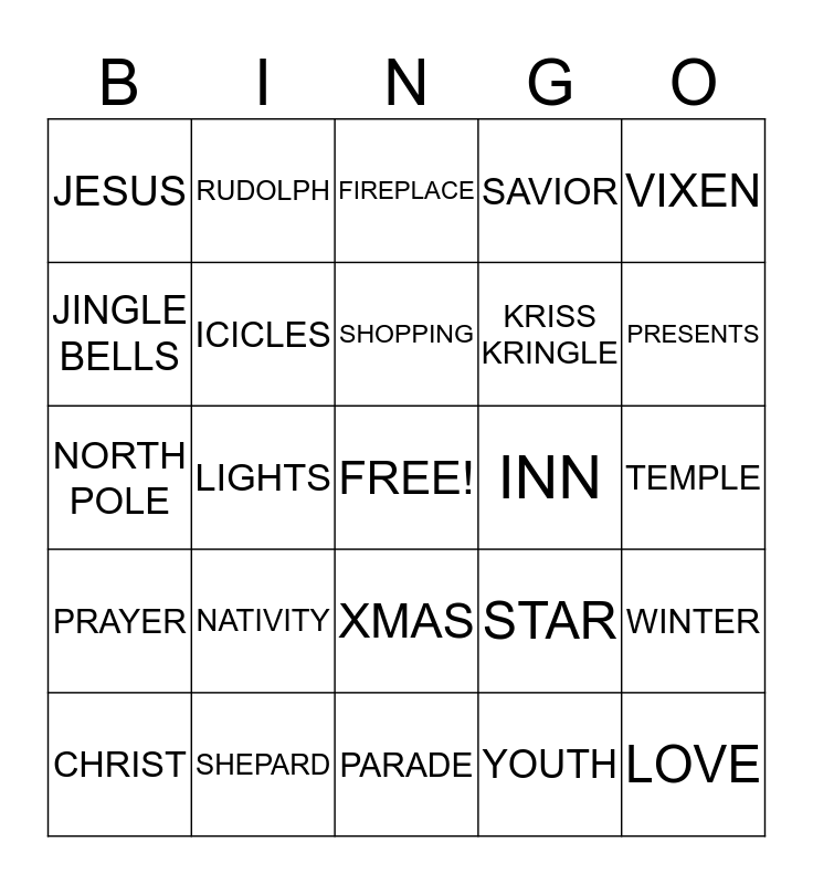 This bingo card has a free space and 84 words: FAITH, FAMILY, FIREPLACE, FROSTY THE SNOWMAN, GRINCH, GINGERBREAD, GRACE, HANUKKAH, HEAVENLY, HOLIDAY, HOPE, HYMNS, ICICLES, INN, JACK FROST, JESUS, CHRIST, JINGLE BELLS, JOY TO THE WORLD, KWANZA, KING, KRISS KRINGLE, LOVE, LITTLE DRUMMER BOY, LIGHTS, MANGER, MERRY, MISTLETOE, MRS. CLAUS, MUSIC, NATIVITY, NEW YEAR'S DAY, NOEL, NORTH POLE, NUTS, ORNAMENT, PARADE, PRANCER, PRESENTS, PRAYER, POINSETTA, PEACE, REINDEER, REJOICE, RELIGION, RIBBONS, RUDOLPH, SAINT NICK, SANTA CLAUS, SLEIGH, SILVER BELLS, STAR, SAVIOR, SCROOGE, SLEIGH BELLS, SNOWMAN, SHEPARD, SHOPPING, SONGS, TEMPLE, THANKFUL, THANKS, TOYS, TREE, TRADITION, UNITY, UNWRAP, VALUES, VIXEN, WALNUTS, WINTER, WISE MEN, WORSHIPPER, WRAPPING PAPER, XMAS, YOUTH, ZESTY, COWBOYS, STEELERS, 49ers, BENGALS, PATRIOTS, EAGLES and SAINTS.