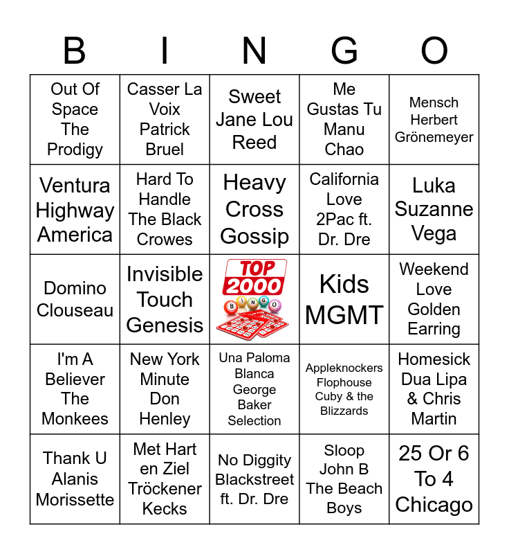 This bingo card has a free space and 48 words: Pa Doe Maar, 25 Or 6 To 4 Chicago, Wanna Be Startin' Somethin' Michael Jackson, No Diggity Blackstreet ft. Dr. Dre, New York Minute Don Henley, High On Life Martin Garrix, Casser La Voix Patrick Bruel, Karma Chameleon Culture Club, Ventura Highway America, Memory Remains Metallica, Hard To Handle The Black Crowes, Me Gustas Tu Manu Chao, Homesick Dua Lipa & Chris Martin, Appleknockers Flophouse Cuby & the Blizzards, Unbeschreiblich Weiblich Nina Hagen, Hot For Teacher Van Halen, Heavy Cross Gossip, Kids MGMT, Lego House Ed Sheeran, Mensch Herbert Grönemeyer, Invisible Touch Genesis, Sloop John B The Beach Boys, Out Of Space The Prodigy, California Love 2Pac ft. Dr. Dre, Novocaine For The Soul Eels, Luka Suzanne Vega, Thank U Alanis Morissette, Señorita Shawn Mendes & C. Cabello, Una Paloma Blanca George Baker Selection, I'm A Believer The Monkees, Tumble And Fall Johan, (Something Inside) So Strong Labi Siffre, Rhythm Is A Dancer Snap!, Hey Ya! OutKast, Met Hart en Ziel Tröckener Kecks, Strange Machines The Gathering, Hey Boy Hey Girl The Chemical Brothers, Weekend Love Golden Earring, All Apologies Nirvana, 7 Seconds Y. N'Dour & Neneh Cherry, Working On A Dream Bruce Springsteen, Bagagedrager Spinvis, Sweet Jane Lou Reed, Budapest George Ezra, Domino Clouseau, Need You Now Lady Antebellum, Hold Me Teskey Brothers and When I Come Around Green Day.