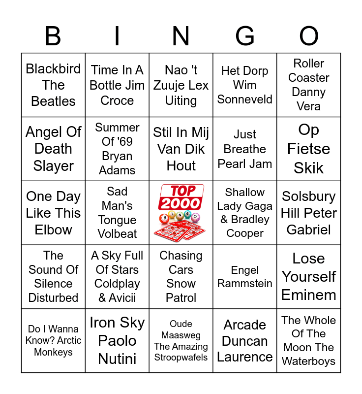 This bingo card has a free space and 48 words: Can I Play With Madness Iron Maiden, The Whole Of The Moon The Waterboys, Empire State Of Mind Jay-Z & Alicia Keys, Oude Maasweg The Amazing Stroopwafels, A Sky Full Of Stars Coldplay & Avicii, Jolene Dolly Parton, Time In A Bottle Jim Croce, Une Belle Histoire Michel Fugain, Angel Of Death Slayer, Skyfall Adele, Summer Of '69 Bryan Adams, Het Dorp Wim Sonneveld, Lose Yourself Eminem, Engel Rammstein, Another Love Tom Odell, In The Ghetto Elvis Presley, Stil In Mij Van Dik Hout, Shallow Lady Gaga & Bradley Cooper, Hey Brother Avicii, Roller Coaster Danny Vera, Sad Man's Tongue Volbeat, Arcade Duncan Laurence, Blackbird The Beatles, Just Breathe Pearl Jam, Money Pink Floyd, Op Fietse Skik, Do I Wanna Know? Arctic Monkeys, Atemlos Durch Die Nacht Helene Fischer, Chasing Cars Snow Patrol, The Sound Of Silence Disturbed, My Hometown Bruce Springsteen, Black Hole Sun Soundgarden, Take Me Home, Country Roads John Denver, Three Little Birds Bob Marley & The Wailers, Iron Sky Paolo Nutini, Africa Toto, Take Me To Church Hozier, Solsbury Hill Peter Gabriel, Als Het Avond Is Suzan & Freek, Ice Queen Within Temptation, Riders On The Storm The Doors, Hotel California Eagles, Nao 't Zuuje Lex Uiting, Back In Black AC/DC, One Day Like This Elbow, September Earth, Wind & Fire, Dansen Aan Zee Bløf and Islands In The Stream Kenny Rogers & Dolly Parton.