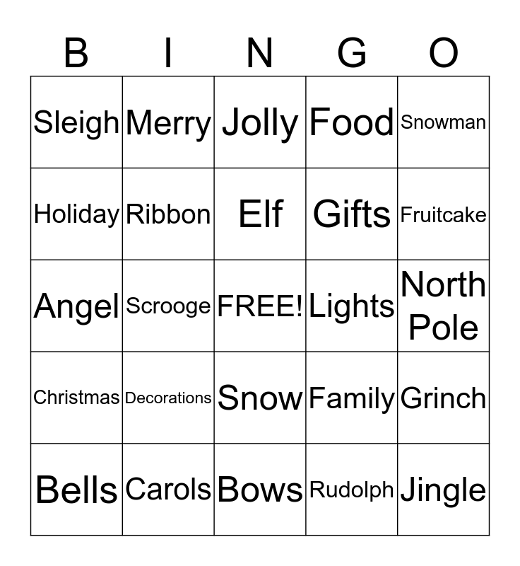 This bingo card has a free space and 24 words: Decorations, Carols, Elf, Bells, Snowman, Sleigh, Holiday, Merry, Lights, Snow, Gifts, Angel, Family, Grinch, Ribbon, Rudolph, North Pole, Jolly, Fruitcake, Scrooge, Jingle, Christmas, Food and Bows.