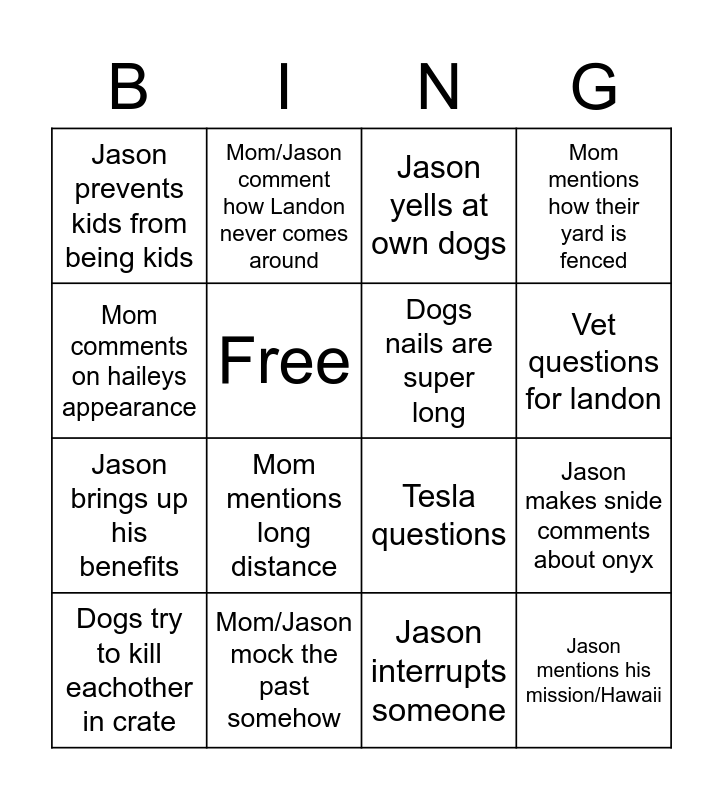 This bingo card has 16 words: Mom/Jason mock the past somehow, Jason makes snide comments about onyx, Jason yells at own dogs, Jason prevents kids from being kids, Jason brings up his benefits, Mom/Jason comment how Landon never comes around, Tesla questions, Jason interrupts someone, Mom comments on haileys appearance, Free, Dogs try to kill eachother in crate, Mom mentions how their yard is fenced, Mom mentions long distance, Vet questions for landon, Dogs nails are super long and Jason mentions his mission/Hawaii.