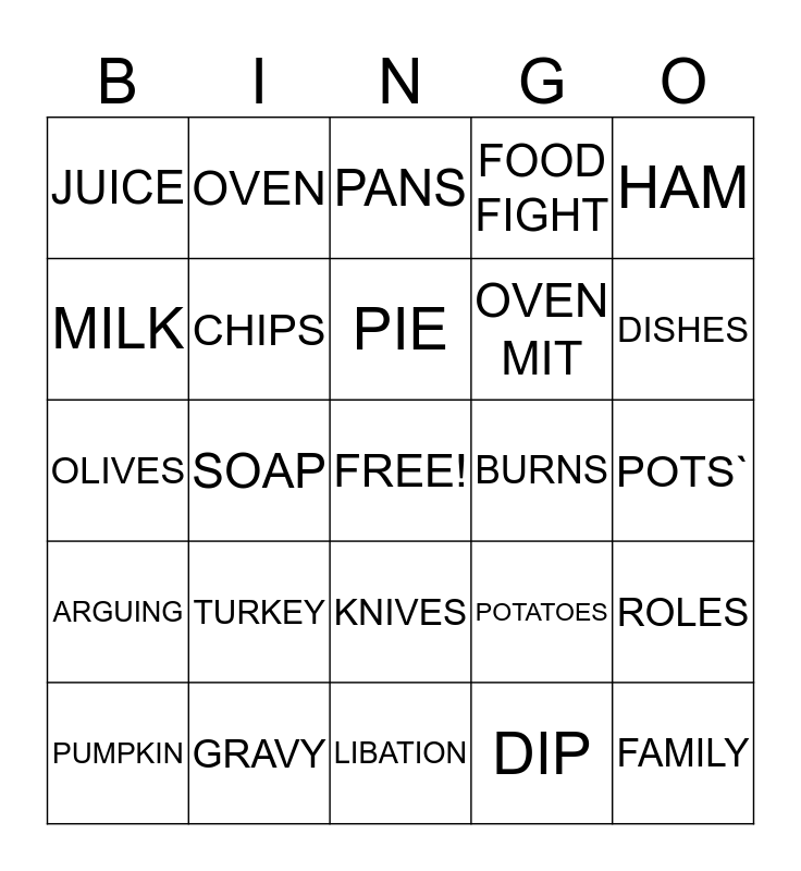 This bingo card has a free space and 24 words: TURKEY, GRAVY, PIE, PUMPKIN, HAM, JUICE, MILK, OVEN, BURNS, KNIVES, OVEN MIT, OLIVES, POTATOES, ROLES, CHIPS, DIP, POTS`, PANS, DISHES, SOAP, FAMILY, ARGUING, FOOD FIGHT and LIBATION.