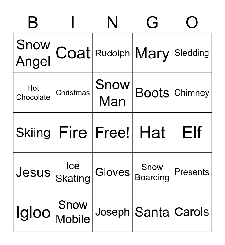 This bingo card has a free space and 24 words: Ice Skating, Snow Mobile, Snow Man, Igloo, Sledding, Snow Angel, Hot Chocolate, Coat, Hat, Gloves, Boots, Skiing, Snow Boarding, Presents, Christmas, Santa, Elf, Rudolph, Chimney, Fire, Carols, Jesus, Mary and Joseph.