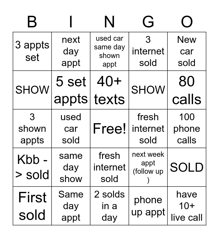This bingo card has a free space and 24 words: First sold, same day show, 40+ texts, phone up appt, New car sold, 3 appts set, next day appt, used car same day shown appt, fresh internet sold, 100 phone calls, 3 shown appts, 5 set appts, next week appt (follow up ), SOLD, SHOW, Same day appt, 2 solds in a day, 3 internet sold, 80 calls, Kbb -> sold, used car sold, fresh internet sold, SHOW and have 10+ live call.