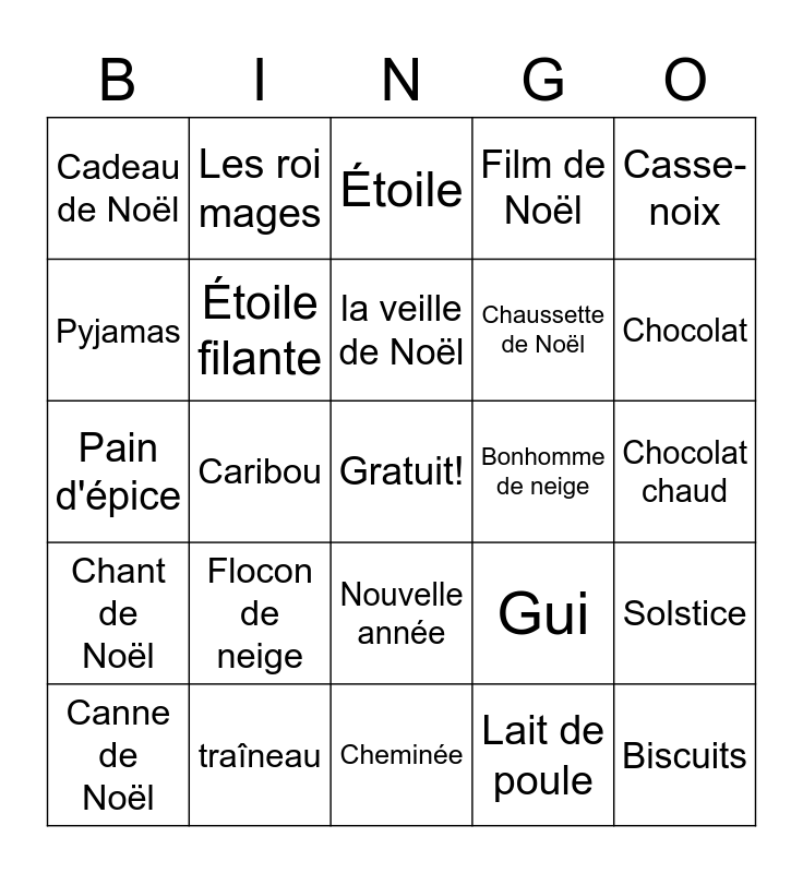 This bingo card has a free space and 29 words: Canne de Noël, Père Noël, Caribou, Sapin de Noël, Cadeau de Noël, Étoile, Étoile filante, Flocon de neige, Bonhomme de neige, traîneau, Chocolat chaud, Biscuits, Cheminée, Lait de poule, Chocolat, Décembre, Nouvelle année, Chant de Noël, Casse-noix, Pain d'épice, Gui, Neige, Chaussette de Noël, Pyjamas, Film de Noël, Les roi mages, Solstice, la veille de Noël and Noël.