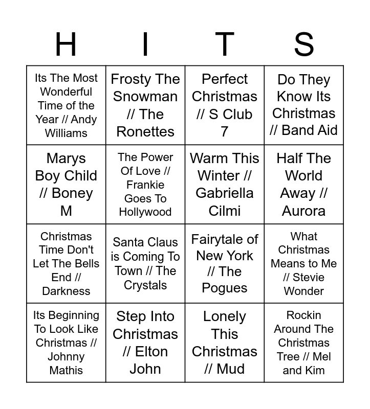 This bingo card has 44 words: Jingle Bell Rock // Brenda Lee, Its Beginning To Look Like Christmas // Johnny Mathis, Blue Christmas // Elvis Presley, Rudolph The Red Nosed Reindeer // The Cadilacs, Merry Christmas Everybody // Slade, Santa Tell Me // Ariana Grande, Perfect Christmas // S Club 7, I Believe In Father Christmas // Greg Lake, Marys Boy Child // Boney M, Stay Another Day // East 17, Do They Know Its Christmas // Band Aid, Step Into Christmas // Elton John, Last Christmas // Wham, Christmas Wrapping // The Waitresses, All I Want For Christmas // Mariah Carey, Please Come Home For Christmas // Bon Jovi, Christmas Is All Around // Bill Nighy, Fairytale of New York // The Pogues, Driving Home For Christmas // Chris Rea, Santa Claus is Coming To Town // The Crystals, Frosty The Snowman // The Ronettes, Deck The Halls // Mcfly, Happy Xmas // John Lennon, Its The Most Wonderful Time of the Year // Andy Williams, I Wish It Could Be Christmas Everyday // Wizzard, Lonely This Christmas // Mud, Wonderful Christmastime // Paul McCartney, Chestnuts Roasting on an Open Fire // Toy Bennett, Stop The Cavalry // Jona Lewie, Rockin Around The Christmas Tree // Mel and Kim, Santa Baby // Kylie Minogue, When A Child Is Born // Johnny Mathis, 2000 Miles // The Pretenders, Baby Its Cold Outside // Tom Jones & Cerys Matthews, What Christmas Means to Me // Stevie Wonder, Oh Holy Night // Glee Cast, Let It Snow // Dean Martin, Merry Christmas Everyone // Shakin Stevens, Half The World Away // Aurora, The Power Of Love // Frankie Goes To Hollywood, Christmas Time Don't Let The Bells End // Darkness, A Winters Tale // David Essex, Warm This Winter // Gabriella Cilmi and Jingle Bells // Dolly Parton.