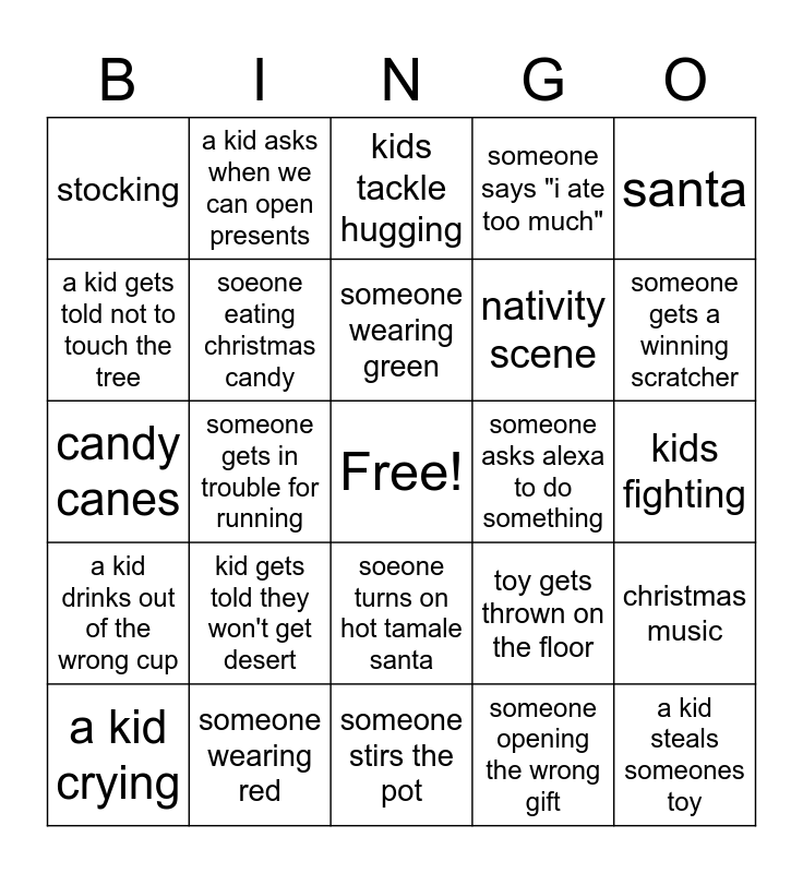 This bingo card has a free space and 24 words: kid gets told they won't get desert, someone wearing red, someone wearing green, a kid crying, santa, stocking, a kid gets told not to touch the tree, a kid asks when we can open presents, someone asks alexa to do something, soeone turns on hot tamale santa, nativity scene, candy canes, toy gets thrown on the floor, christmas music, soeone eating christmas candy, someone opening the wrong gift, kids fighting, kids tackle hugging, someone gets a winning scratcher, someone gets in trouble for running, a kid steals someones toy, a kid drinks out of the wrong cup, someone says "i ate too much" and someone stirs the pot.