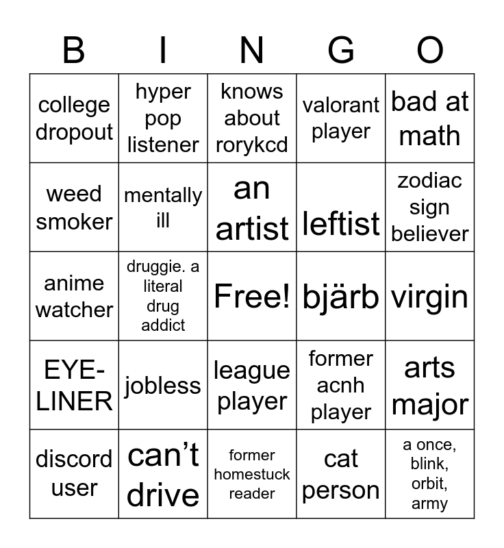 This bingo card has a free space and 24 words: jobless, can’t drive, an artist, discord user, bad at math, college dropout, weed smoker, hyper pop listener, bjärb, league player, leftist, anime watcher, former acnh player, arts major, mentally ill, cat person, virgin, knows about rorykcd, zodiac sign believer, druggie. a literal drug addict, a once, blink, orbit, army, EYE-LINER, valorant player and former homestuck reader.