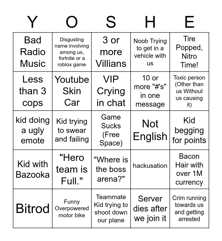 This bingo card has a free space and 24 words: "Hero team is Full.", Funny Overpowered motor bike, VIP Crying in chat, Bitrod, Tire Popped, Nitro Time!, Bad Radio Music, Less than 3 cops, Disgusting name involving among us, fortnite or a roblox game, Not English, "Where is the boss arena?", 10 or more "#'s" in one message, kid doing a ugly emote, hackusation, Bacon Hair with over 1M currency, Youtube Skin Car, Server dies after we join it, Kid begging for points, 3 or more Villians, Toxic person (Other than us Without us causing it), Kid trying to swear and failing, Crim running towards us and getting arrested, Kid with Bazooka, Noob Trying to get in a vehicle with us and Teammate Kid trying to shoot down our plane.