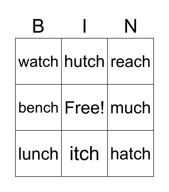 This bingo card has a free space and 14 words: beach, fetch, lunch, hutch, bench, hatch, bunch, witch, itch, watch, march, much, reach and pitch.
