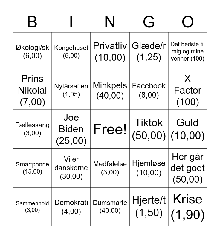 This bingo card has a free space and 294 words: Jul/en (1,05), Verden (1,05), Nytårsaften (1,05), 2020 (1,05), 2021 (1,05), Nytårshilsen (1,05), Europa (1,10), Coronavirus/sen (1,10), Ældre (1,10), Arbejde (1,15), Pandemi (1,15), Fødselsdag/e (1,15), Unge (1,15), Kronprinsen (1,20), Prins Joachim (1,20), Dagligdag/en (1,25), Håb (1,25), Juleaften (1,25), Nytårsønsker (1,25), Pårørende (1,25), Frankrig (1,25), Glæde/r (1,25), Generationer (1,30), Kronprinsessen (1,30), Afstand (1,30), Mundbind (1,30), Afsavn (1,40), Corona/en (1,40), Muligheder (1,40), Politi/et (1,40), Prinsesse Marie (1,40), Genforening/en (1,40), Hjerte/t (1,50), Covid-19 (1,50), Klima/et (1,50), Folk (1,50), Ansvar (1,50), Samfundssind (1,50), Håndsprit (1,50), Omsorg (1,50), Myndighederne (1,50), Sønderjylland/s (1,50), 100 år/et (1,50), Taknemmelig/hed (1,70), Grænse/n (1,70), Prins Christian (1,70), Fællesskab/et (1,70), Sygdom (1,70), Mindretal (1,70), Sundhedspersonale/t (1,70), Stolt/e (1,70), Krise (1,90), Kram (2,00), Særligt (2,00), Frivillig/e (2,25), Ensom/hed (2,25), Hjemmearbejde (2,50), Hjælpepakke/r (2,50), Isolation (2,50), Coronakrisen (2,50), 80 års fødselsdag (2,50), Plejehjem (2,50), Læger (2,50), Sygeplejesker (2,50), Bekymring/er (2,50), Konfirmation/er (2,50), Vaccine/n (2,50), Skolelærer/e (2,50), Atter (2,60), Minder (2,65), Dannebrog (2,65), Restriktioner (2,75), Smittetal/let (2,75), Befolkning/en (2,75), Hospitaler (2,75), Skole/r (2,75), Stunder (3,00), Pressemøde/r (3,00), Klode/n (3,00), Værnemidler (3,00), Tillid/en (3,00), Folkesundhed/en (3,00), Forventning/er (3,00), Befrielsen (3,00), Institutioner (3,00), Beskytte/r (3,00), Alvor (3,00), Verdenssamfund/et (3,00), Konsekvenser (3,00), Afkald (3,00), Medfølelse (3,00), Fællessang (3,00), Helbred/et (3,50), Tilbageblik (3,50), Håndtryk (3,50), Krisetid/er (3,50), Time/r (3,50), Forsamlingsforbud (3,50), Hjernen (3,50), Sammenhold (3,00), Optimisme (3,50), Krig (4,00), Nedlukning (4,00), Smittespredning (4,00), Kongeskibet (4,00), Vækst/en (4,00), Abdicere/r (4,00), Rigsfællesskabet (4,00), Børnehave/r (4,00), Fred (4,00), Terror/en (4,00), Demokrati (4,00), Rådhusklokkerne (4,00), Bemærkning/er (4,50), Bryllup/per (4,00), Nærvær (4,00), Tolerance (4,00), Sammen hver for sig (4,50), Facetime (5,00), Test/et (5,00), Sociale Medier (5,00), Tyskland (5,00), Erhvervsdrivende (5,00), Vejr/et (5,00), Krænke/lse (5,00), Forskelligheder (5,00), Mærkeår (5,00), Kongehuset (5,00), Juletræ/et (5,00), Online (5,00), Klimaforandringer/ne (5,00), Kronprins Frederik (5,00), Rengøring (5,00), Statsministeren (5,00), Kærlighed (5,00), Erhvervslivet (5,00), Økonomi (5,50), Pension (6,00), Amalienborg (6,00), Island (6,00), Vinder (6,00), Nytårsfortsæt (6,00), Erhverv (6,00), Konflikt/er (6,00), Økologi/sk (6,00), Kronprinsesse Mary (6,00), Uganda (6,00), Flygtninge (7,00), Afrika (7,00), Ferierejse/r (7,00), USA (7,00), Puslespil (7,00), EM i fodbold (7,00), Prins Nikolai (7,00), Mink (7,00), Fattigdom (7,00), Karantæne (7,50), Skat (8,00), Facebook (8,00), Sverige (8,00), Mobning (8,00), Blomster (8,00), Brexit (8,00), Genåbning (8,00), Smitteudbrud (8,00), Global opvarmning (10,00), Taber (10,00), Tørke (10,00), Bivirkning/er (10,00), Druk (10,00), Ligheder (10,00), England (10,00), Privatliv (10,00), Swipe (10,00), Hjemløse (10,00), Krone (10,00), Mangfoldighed (10,00), E-Sport (10,00), Minkavler (10,00), MeToo (10,00), Smittesporing (10,00), Lockdown (10,00), Testcenter (10,00), Begavet (10,00), Guld (10,00), Beklager (10,00), Livgarden (10,00), Royal Run (12,00), EU (12,00), Penge (12,00), Norge (12,00), Folketinget (12,00), Minut/ter (12,00), Teenager (12,00), Hverdagshelte (12,00), EM i håndbold (15,00), Cyklus (15,00), Feriepenge/ne (15,00), Landsholdet (15,00), Smartphone (15,00), Likes (15,00), Uafhængighed (15,00), Wuhan (15,00), Kassedame/r (15,00), Søens folk (18,00), Regeringen (18,00), Mette Frederiksen (18,00), Viking/er (20,00), Skyderi (20,00), Flagermus (20,00), Podcast (20,00), Twitter (20,00), Eventyr (20,00), Julekalender (20,00), Instagram (20,00), Veganer (20,00), Toiletpapir (20,00), Hamstre/r (20,00), Kvindelandsholdet (20,00), Herrelandsholdet (20,00), Snapchat (20,00), Skolestart (20,00), Uanset hvad (20,00), Ipad (25,00), Rusland (25,00), Hvid jul (25,00), Asyl (25,00), Donald Trump (25,00), Joe Biden (25,00), Fodboldlandsholdet (25,00), Mutation (25,00), Vi er danskerne (30,00), Curlingforældre (30,00), Verdensmålene (30,00), Dumsmarte (40,00), Fake News (40,00), Lovhjemmel (40,00), Cybertrussel (40,00), Minkpels (40,00), En del af noget større (40,00), Youtubere (50,00), Blogger (50,00), Folkemøde (50,00), Moske (50,00), Counter Strike (50,00), Tiktok (50,00), Her går det godt (50,00), Præsidentvalg (40,00), Dus (50,00), Nationaltest (55,00), Det plejede far at gøre (60,00), Black Lives Matter (66,00), Sofie Linde (75,00), Frokostpause (75,00), Dokumentfalsk (75,00), Søren Brostrøm (75,00), Magnus Heunicke (75,00), Kåre Mølbak (75,00), Skattelettelser (75,00), Europol (100), Bruxelles (100), DR (100), TV (2100), Vild med Dans (100), Den store bagedyst (100), Elefantordenen (100), Ministerrokade (100), X Factor (100), Hvidvask (100), Danmarks Radio (100), Landmand søger kærlighed (100), Det bedste til mig og mine venner (100), Shu-bi-dua (100), Michael Bundesen (150), Diego Maradona (200), Eurovision (200), Champions League (200), Masterclass (200), Registreringsafgift (200), Kamala Harris (200), Flere fans på stadion (300), NOVA (500), Ståle Solbakken (500), Jeg har en plan (500), Billed Bladet (500), Go Morgen P3 (500), P4 (500), Natholdet (500), Se & Hør (500), BT (500), Ekstra Bladet (500), Melvin Kakooza (500), Pilfingerdansen (500) and Det er det falske sted (500).
