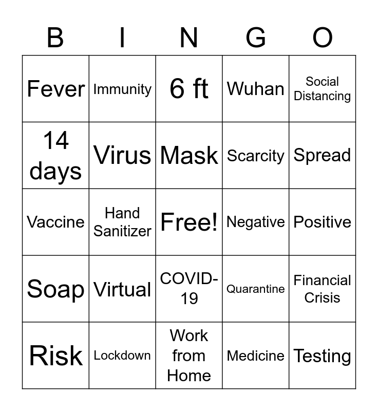 This bingo card has a free space and 41 words: Coronavirus, Vaccine, Pandemic, Virus, Lockdown, COVID-19, Mask, Gloves, Social Distancing, Soap, Hand Sanitizer, Wuhan, Testing, Positive, Negative, Virtual, Cough, Fever, Symptoms, 6 ft, Financial Crisis, 2020, Work from Home, Scarcity, Frontline Workers, Medical Proffesionals, Medicine, Viral Infection, Spread, Cases, Deaths, Immunity, Risk, Outbreak, Quarantine, 14 days, Ventilator, Travel Restrictions, Contact Tracing, Face Shield and New Hobbies.