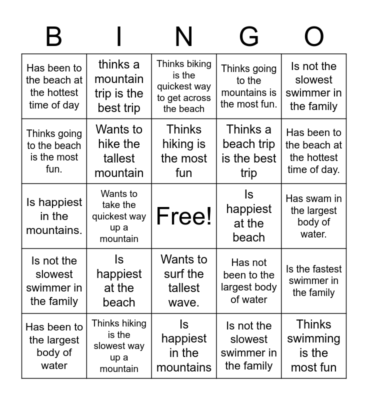 This bingo card has a free space and 24 words: Is happiest at the beach, Thinks hiking is the slowest way up a mountain, Thinks hiking is the most fun, Has been to the largest body of water, Is not the slowest swimmer in the family, Has been to the beach at the hottest time of day, Thinks going to the beach is the most fun., thinks a mountain trip is the best trip, Is happiest at the beach, Wants to surf the tallest wave., Thinks a beach trip is the best trip, Is happiest in the mountains., Has not been to the largest body of water, Is the fastest swimmer in the family, Wants to hike the tallest mountain, Is not the slowest swimmer in the family, Has swam in the largest body of water., Thinks biking is the quickest way to get across the beach, Has been to the beach at the hottest time of day., Wants to take the quickest way up a mountain, Thinks swimming is the most fun, Is not the slowest swimmer in the family, Thinks going to the mountains is the most fun. and Is happiest in the mountains.