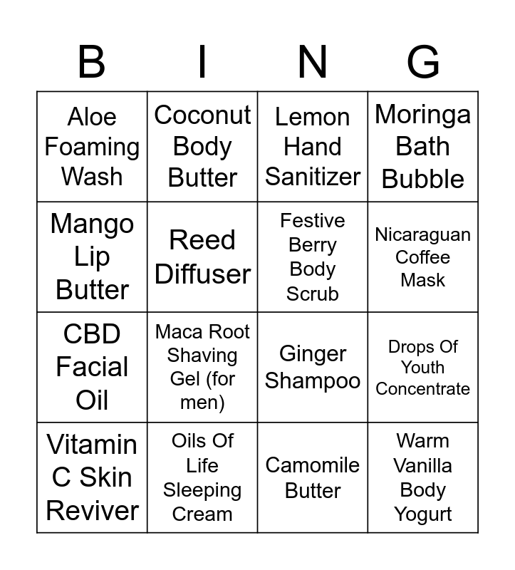 This bingo card has 30 words: Himalayan Mask, Tea Tree Toner, Camomile Butter, Vitamin E Moisturiser, Aloe Foaming Wash, Coconut Body Butter, Festive Berry Body Scrub, Warm Vanilla Body Yogurt, Drops Of Youth Peel, Oils Of Life Sleeping Cream, Roots of Strength Serum, Drops Of Youth Concentrate, Strawberry Hand Cream, Fuji Green Tea Shower Gel, Ginger Shampoo, Seaweed Cleansing Exfoliator, Peppermint Foot Scrub, Maca Root Shaving Gel (for men), Pink Grapefruit Shower Gel, Moringa Bath Bubble, Vitamin C Skin Reviver, Hemp Hand Cream, Lemon Hand Sanitizer, Nicaraguan Coffee Mask, Mango Lip Butter, Reed Diffuser, Lash Hero Mascara, Grapeseed Glossing Serum, CBD Facial Oil and Carrot Face Wash.