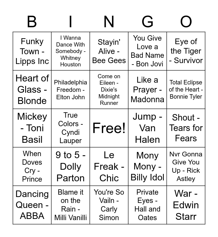 This bingo card has a free space and 24 words: 9 to 5 - Dolly Parton, Blame it on the Rain - Milli Vanilli, Come on Eileen - Dixie's Midnight Runner, Dancing Queen - ABBA, Eye of the Tiger - Survivor, Funky Town - Lipps Inc, Heart of Glass - Blonde, I Wanna Dance With Somebody - Whitney Houston, Jump - Van Halen, Le Freak - Chic, Like a Prayer - Madonna, Mickey - Toni Basil, Mony Mony - Billy Idol, Nvr Gonna Give You Up - Rick Astley, Philadelphia Freedom - Elton John, Private Eyes - Hall and Oates, Shout - Tears for Fears, Stayin' Alive - Bee Gees, Total Eclipse of the Heart - Bonnie Tyler, True Colors - Cyndi Lauper, War - Edwin Starr, When Doves Cry - Prince, You Give Love a Bad Name - Bon Jovi and You're So Vailn - Carly Simon.