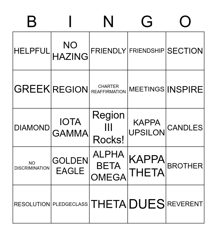 This bingo card has a free space and 88 words: AAMD, ALPHA ALPHA OMICRON, ALPHA BETA OMEGA, ALPHA BETA ZETA, ALPHA DELTA DELTA, ALPHA DELTA XI, ALPHA GAMMA CHI, ALPHA PHI OMEGA, ALPHA ZETA PI, ALUMNI, APO LEADS, BOY SCOUTS, BROTHER, CANDLES, CHAPTER, CHARTER REAFFIRMATION, CHEERFUL, CHICAGO, CLEAN, COLLEGE, COMMITTEE, COURTEOUS, DIAMOND, BRAVE, DUES, EPSILON MU, FAILED, FELLOWSHIP, FORGET ME NOT, FRATERNITY, FRIENDLY, FRIENDSHIP, GAVEL, GIRL SCOUTS, GOLDEN EAGLE, GREEK, HELPFUL, IGNITE, INNOVATE, INSPIRE, IOTA GAMMA, IOTA LAMBDA, KAPPA MU, KAPPA THETA, KAPPA UPSILON, KIND, LAMBDA NU, LEADERSHIP, LOYAL, MEETINGS, MEMBERSHIP, MOTION, MU ALPHA, NAMESAKE, NATIONAL CONVENTION, NEOPHYTE, NO DISCRIMINATION, NO HAZING, OBEDIENT, OFFICER PORTAL, OMICRON PHI, PARTICIPATING CITIZEN, PASSED, PI OMICRON, PLEDGE, PLEDGECLASS, PROJECTS, REGION, RESOLUTION, REVERENT, RITUAL, SCOUT LAW, SCOUT OATH, SECTION, SERVICE, SOCIETY OF LIFE MEMBERS, STURDY OAK, TABLECLOTH, THETA, THETA CHI, THRIFTY, TRUSTWORTHY, UNIVERSITY, VOLUNTEER, WORKSHOPS, YOUTH SERVICE GRANT, ZETA BETA and ZETA MU.