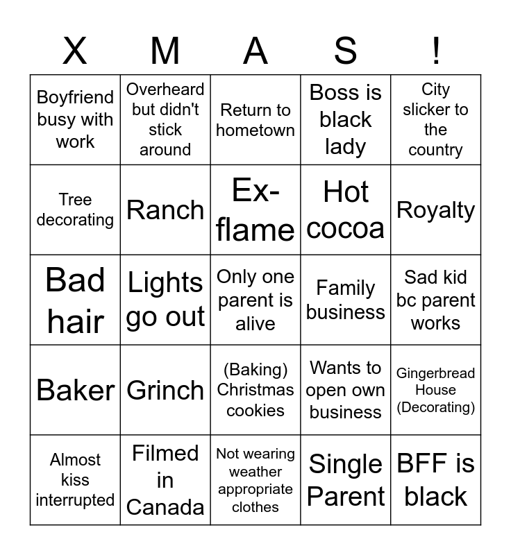 This bingo card has a free space and 34 words: Conflict at 1:35-1:45, Single Parent, Festival, Contest, Baker, Ranch, City slicker to the country, Almost kiss interrupted, Overheard but didn't stick around, Embraces an ex, Ex-flame, Return to hometown, Has sister, Vying for promotion, Family business, Royalty, Filmed in Canada, Bad hair, Grinch, Wants to open own business, (Baking) Christmas cookies, Previously used set, Boyfriend busy with work, Sad kid bc parent works, Not wearing weather appropriate clothes, BFF is black, Boss is black lady, XMAS tree lighting, Hot cocoa, Tree decorating, Tree shopping, Lights go out, Gingerbread House (Decorating) and Animal is their only friend.