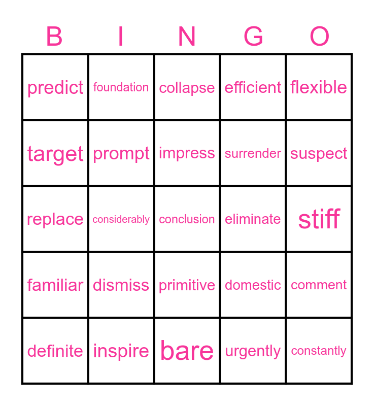 This bingo card has 25 words: dismiss, bare, impress, definite, flexible, predict, target, foundation, eliminate, primitive, surrender, replace, domestic, comment, prompt, constantly, stiff, collapse, suspect, considerably, conclusion, inspire, familiar, efficient and urgently.
