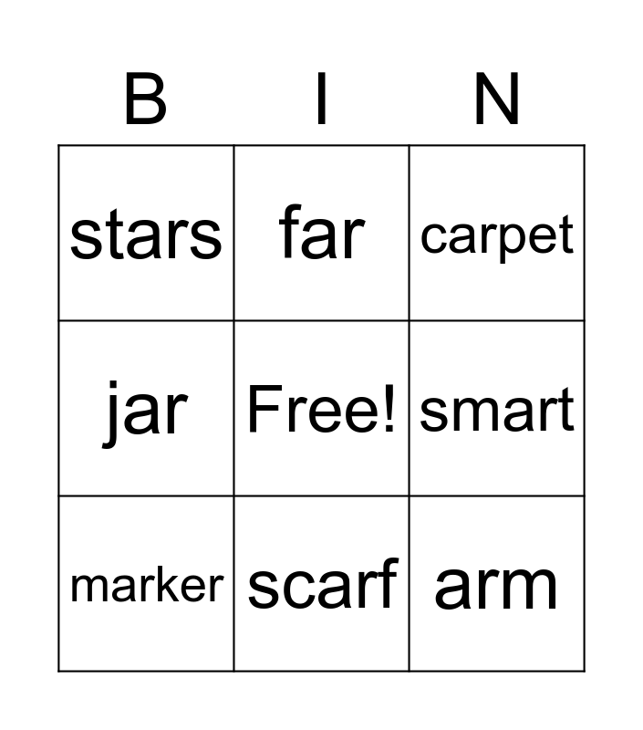 This bingo card has a free space and 12 words: farmer, apart, arm, smart, far, carpet, scarf, barn, stars, jar, marker and party.